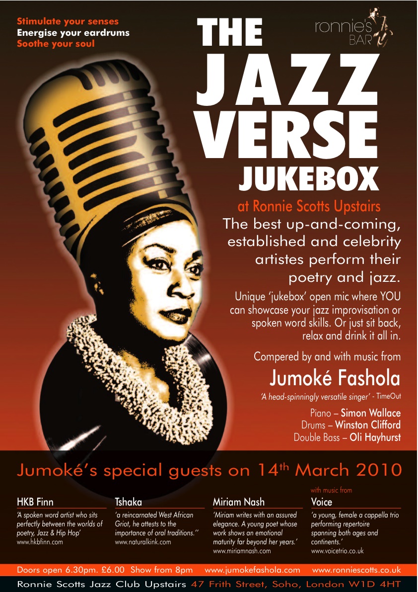 After two months of writing, walking and (I won’t lie) luxuriating in Geneva, March will bring me back to London. On Sunday 14 March, I’ll be performing at Jazz Verse Jukebox, Jumoké Fashola‘s poetry and jazz night at none other than Ronnie Scott’s Jazz Club. Jumoké is an award winning broadcaster and singer, and a truly inspiring lady. HKB Finn, Tshaka and Voice will also be featured, as well as Jumoké’s own band. It promises to be a great night.